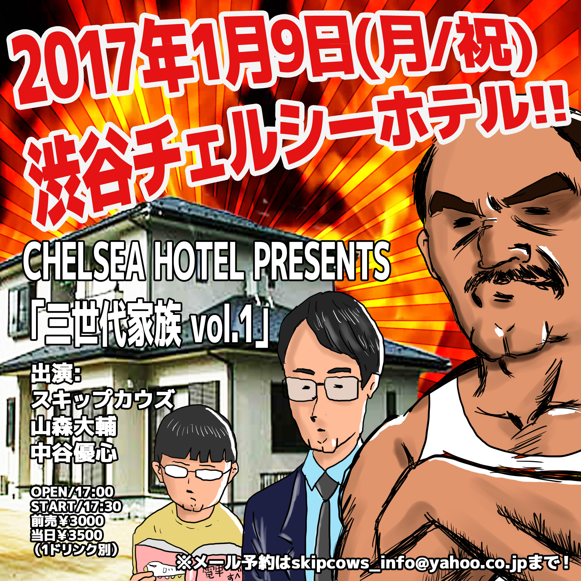 ■2017年1月9日(月)渋谷チェルシーホテル「三世代家族 vol.1」 出演:スキップカウズ、山森大輔、 中谷優心 OPEN17:00/START17:30 前売り¥3000/当日¥3500 (1ドリンク別) 前の記事 次の記事