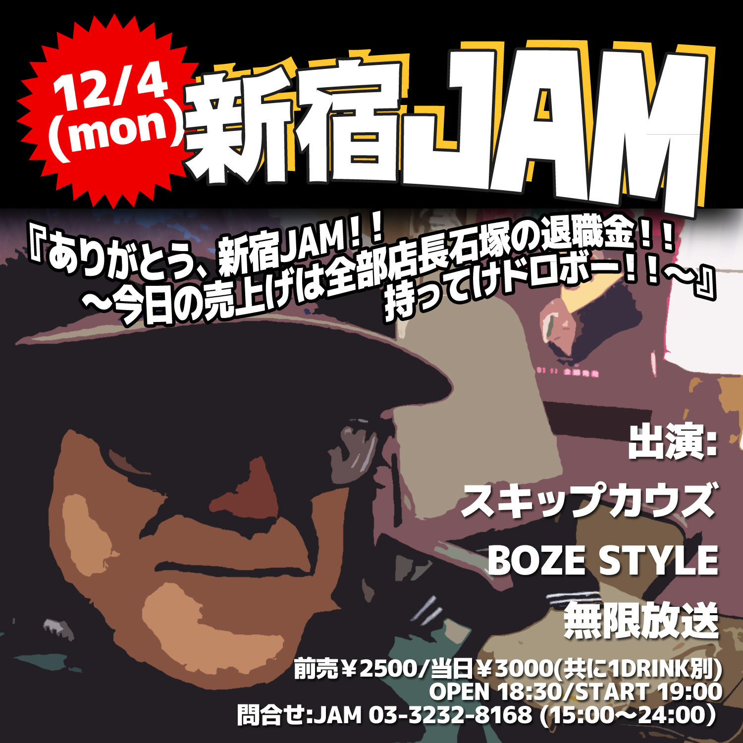 2017年12月4日(月)新宿JAM 『ありがとう、新宿JAM!!~今日の売上げは全部店長石塚の退職金!!持ってけドロボー!!~』 ■2017年12月4日(月)新宿JAM『ありがとう、新宿JAM!!~今日の売上げは全部店長石塚の退職金!!持ってけドロボー!!~』出演:スキップカウズ/BOZE STYLE/無限放送前売¥2500/当日¥3000(共に1DRINK別) OPEN 18:30/START 19:00 前の記事 次の記事