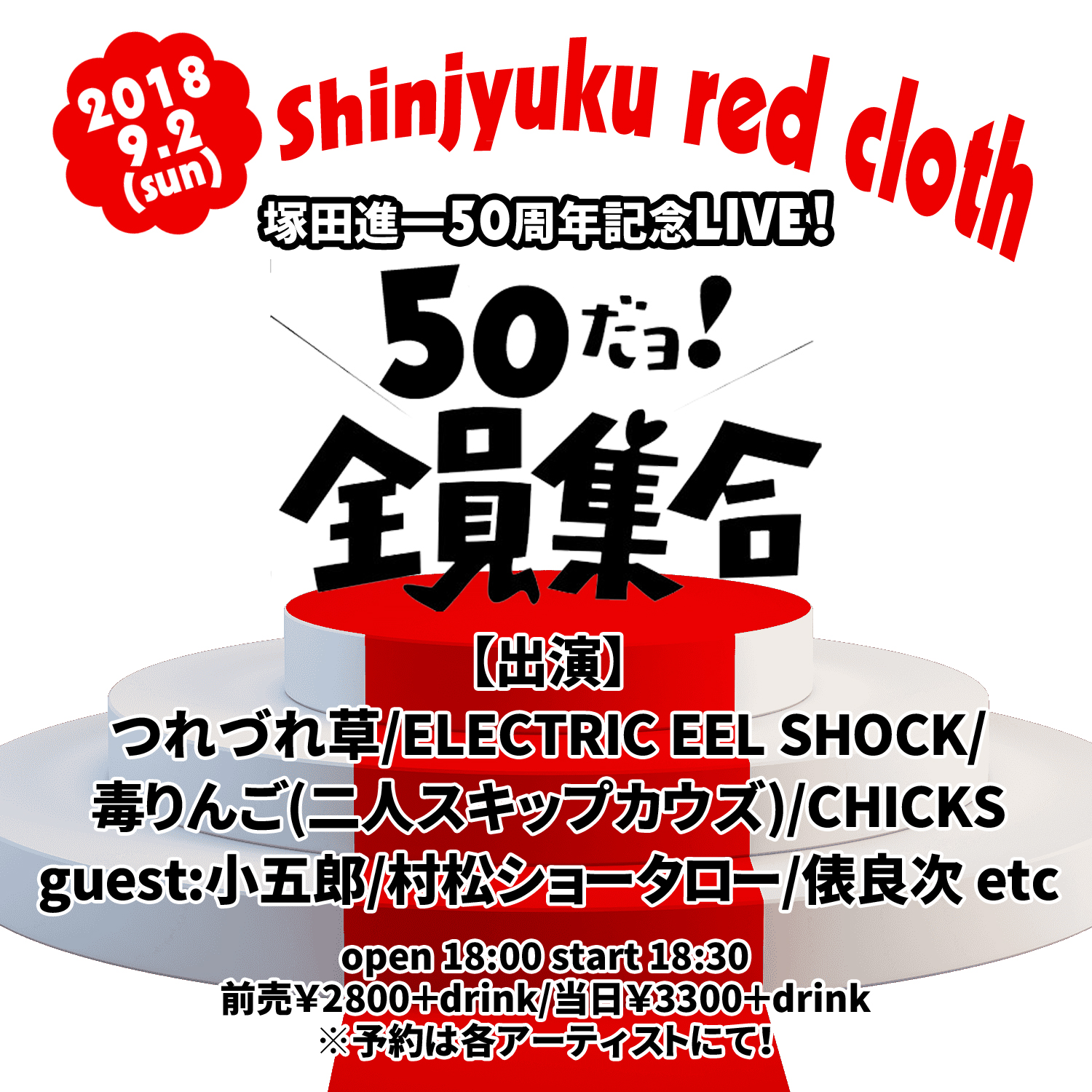 2018年9月2日(日)新宿レッドクロス 塚田進一50周年記念LIVE!「50だよ!全員集合」(2人スキップカウズ) ■2018年9月2日(日)新宿レッドクロス 塚田進一50周年記念LIVE! 「50だよ!全員集合」 出演:つれづれ草/ELECTRIC EEL SHOCK/毒りんご(二人スキップカウズ)/CHICKS guest:小五郎/村松ショータロー/俵良次 etc open 18:00 start 18:30 前売¥2800+drink/当日¥3300+drink 前の記事 次の記事