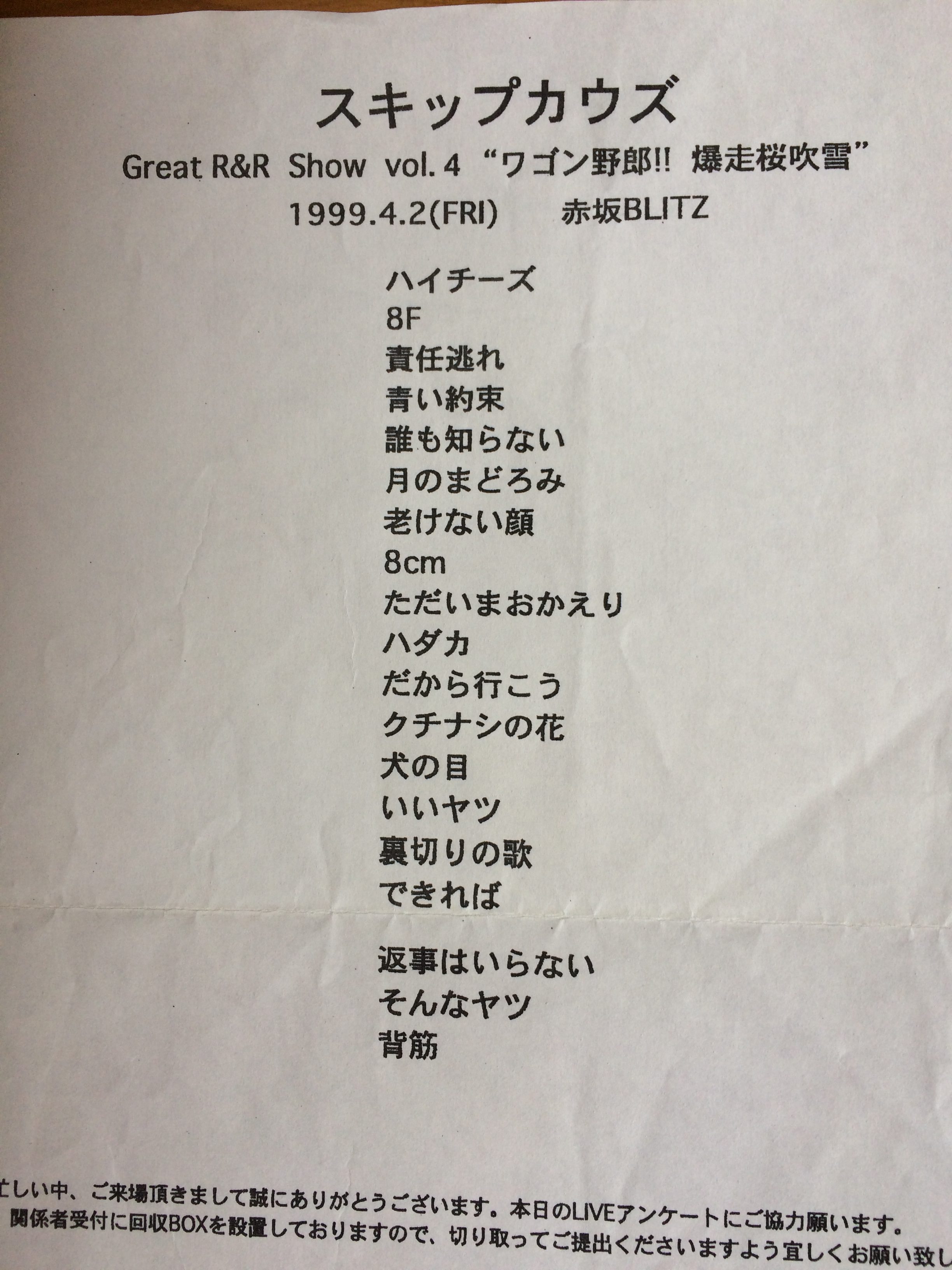 デビュー20年の記録11「1999年赤坂ブリッツセットリスト」